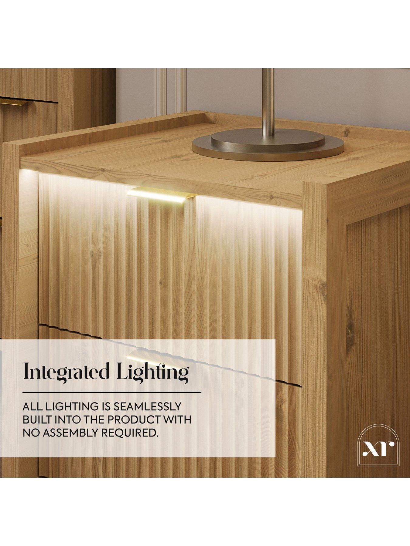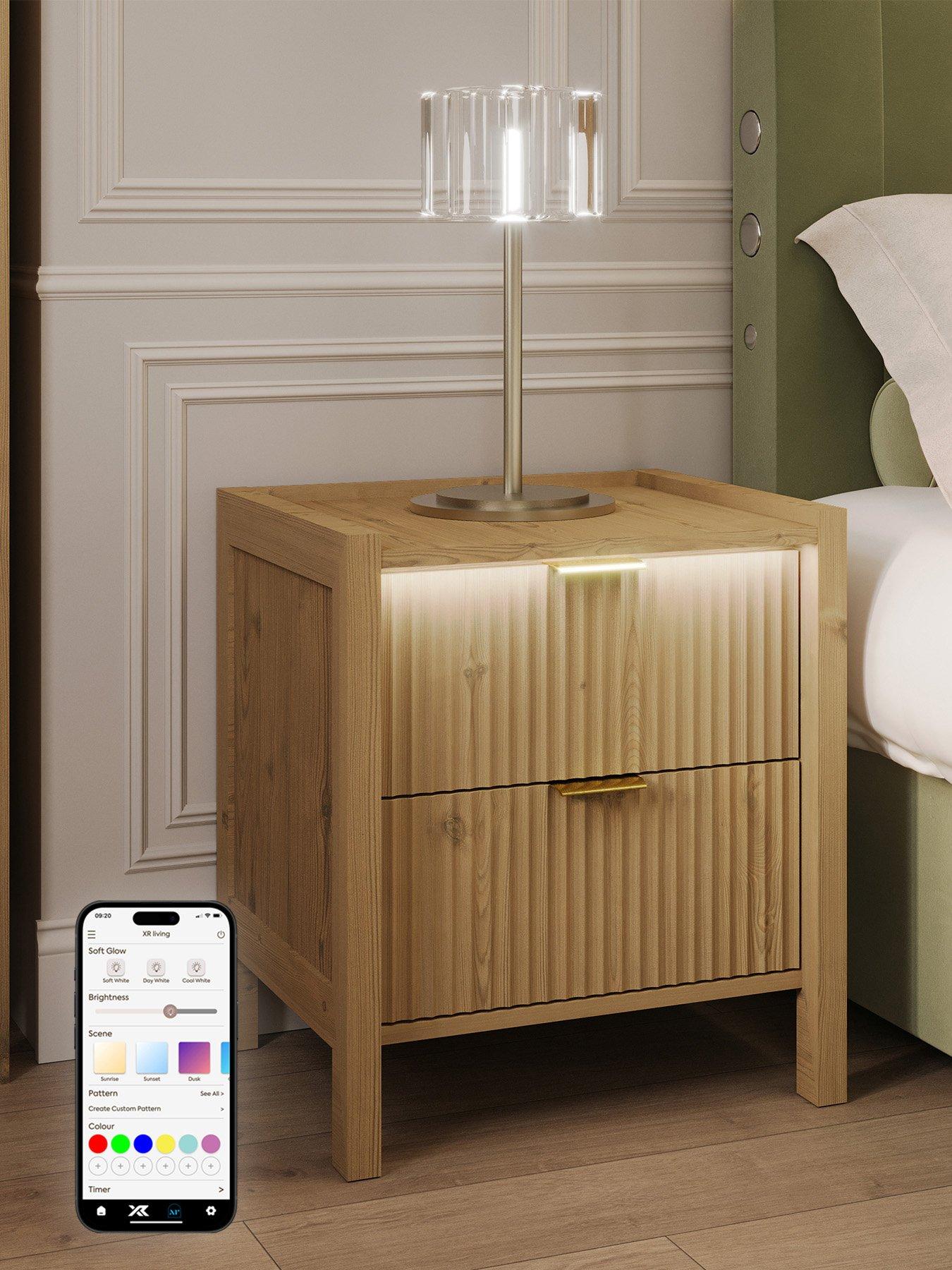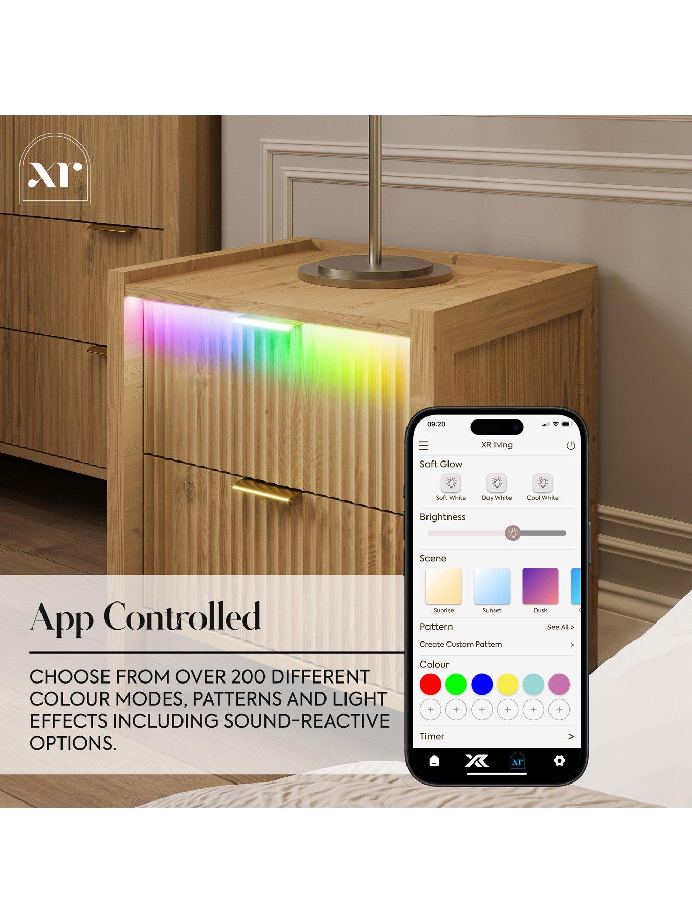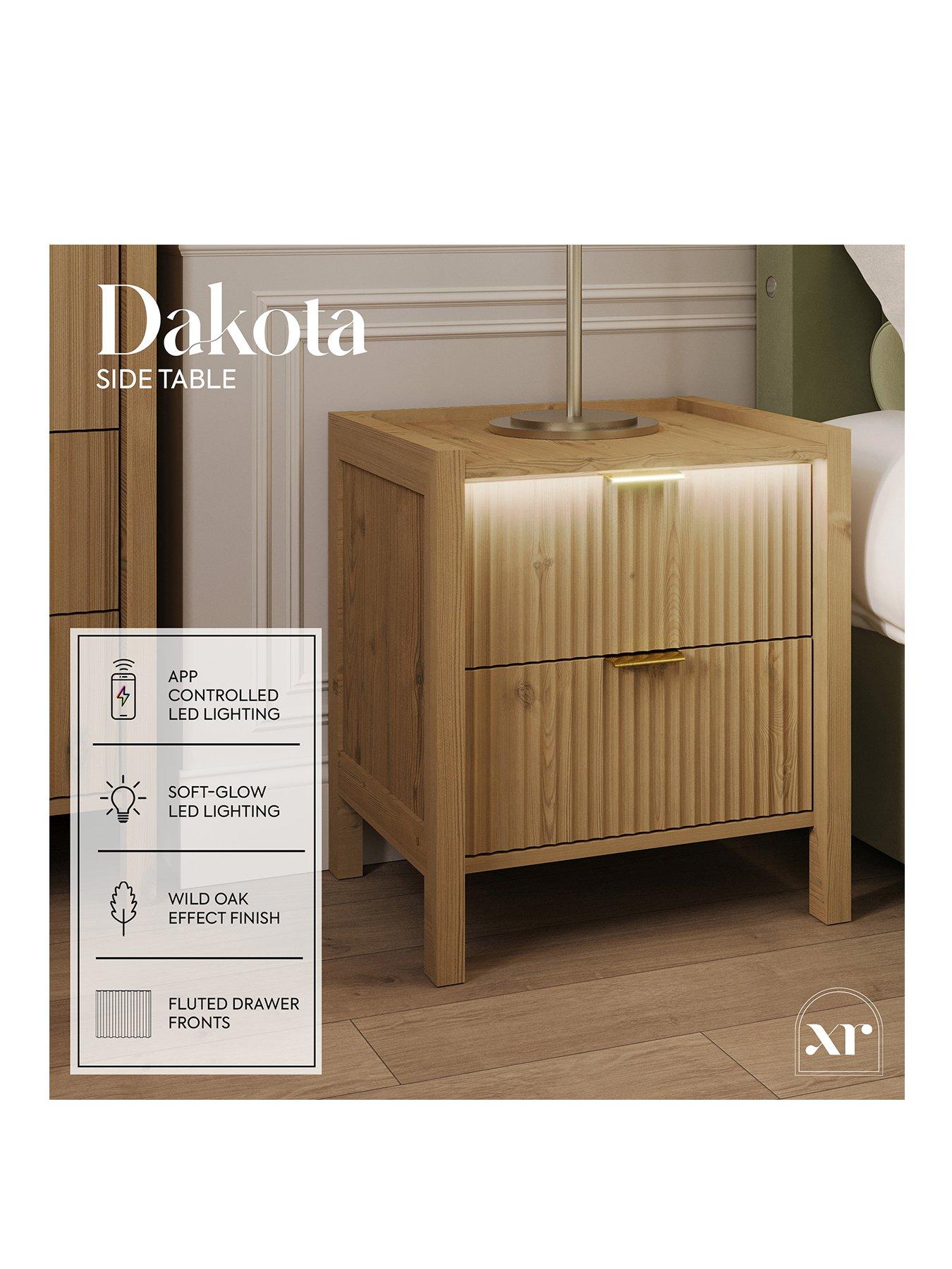 XR Living Dakota Side Table With App Control LightsMeet the Dakota side table, where warm wild oak beauty meets modern convenience. Its sleek, built-in lighting creates a soft, soothing glow that gently washes over the fluted drawer front, adding instant ambience to your space. With easy touch-button control or app-enabled LEDs, you can set the mood in seconds. It's the perfect companion for relaxing evenings, cosy routines, and effortlessly stylish bedrooms.