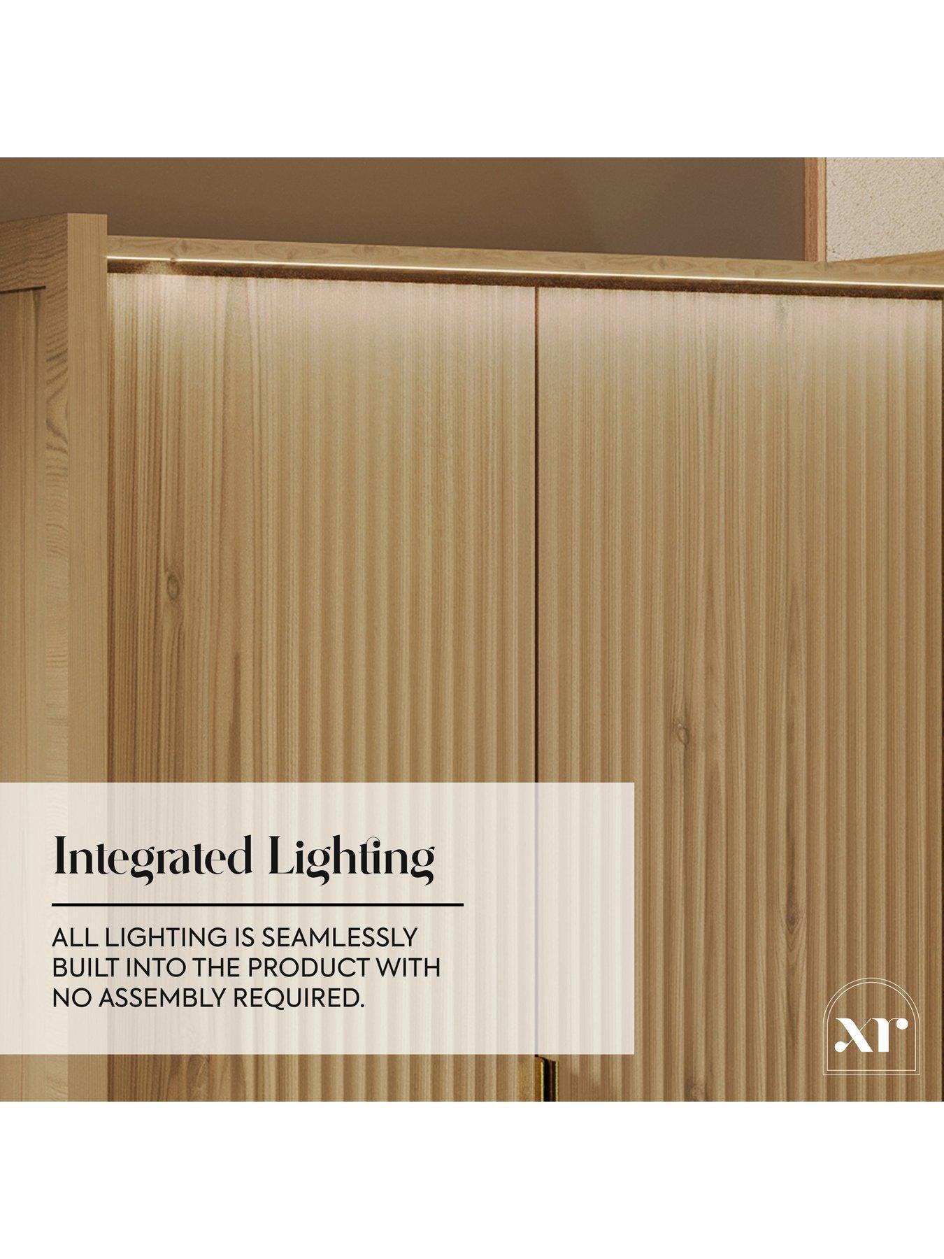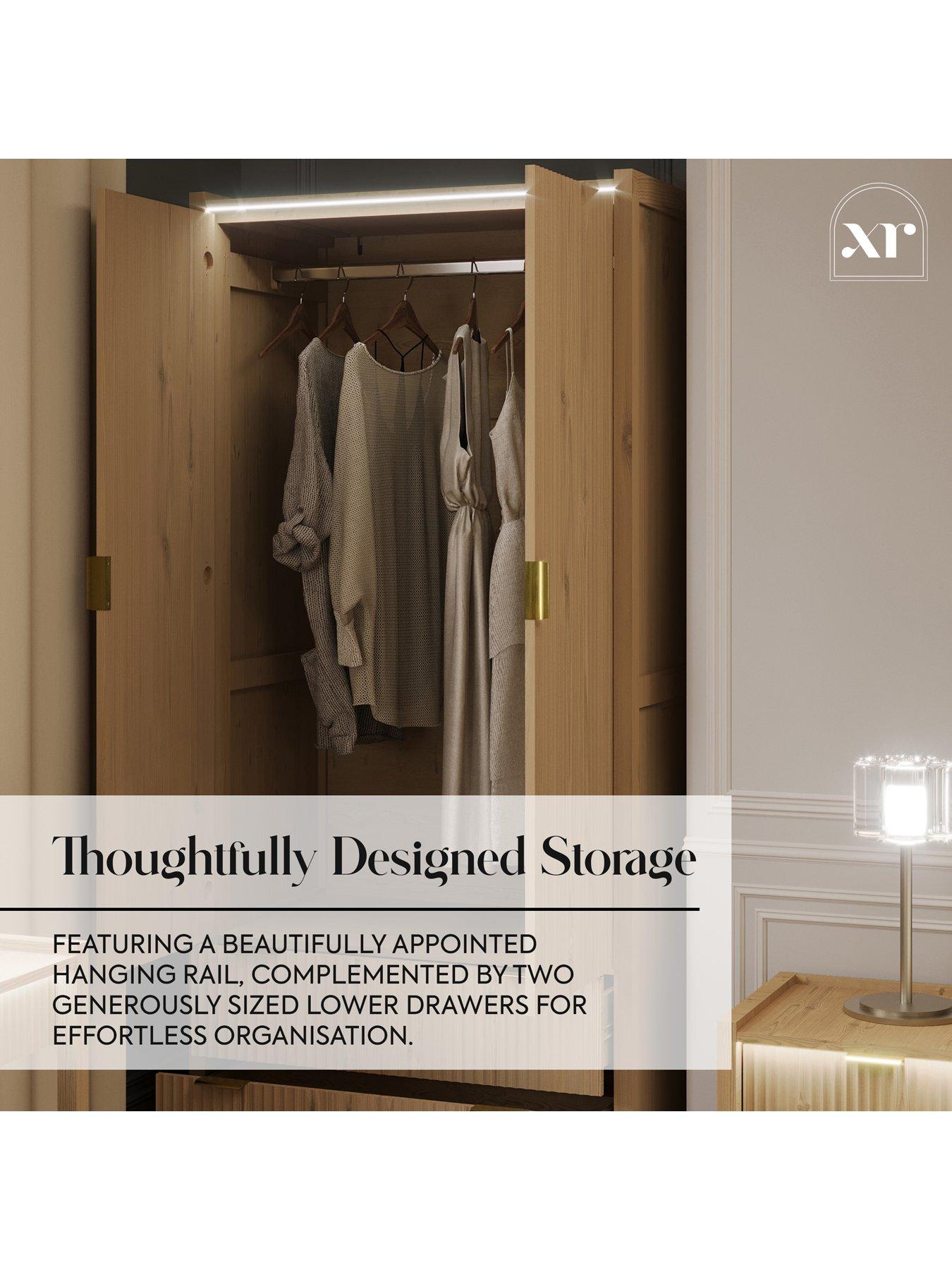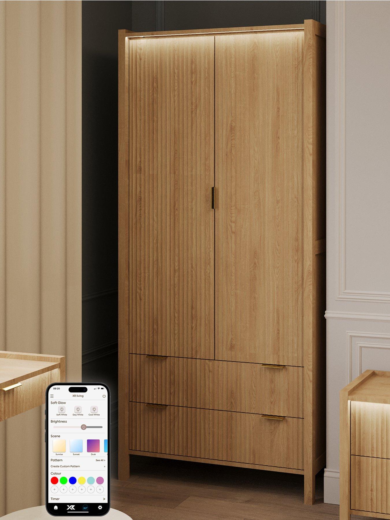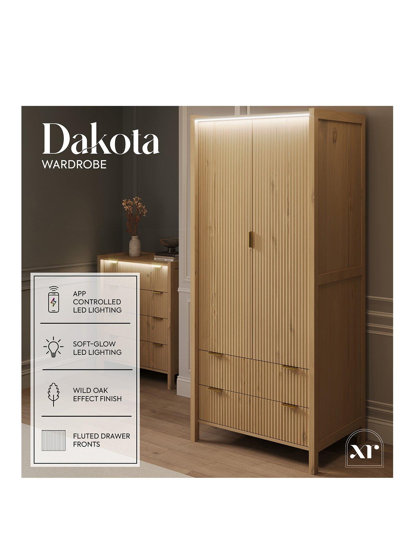 XR Living Dakota Wardrobe With App Control LightsA warm wild oak effect stand out furniture piece that blends natural texture with a smart and modern design. The Dakota 2 Door Wardrobe features integrated LED lighting which gently illuminates from the top front edge, cascading over the fluted double doors to showcase the elegant detailing, whilst creating a calm, ambient glow. Inside, you'll find thoughtful organisation and two spacious drawers below for extra storage, making it easier than ever to keep your bedroom tidy and tranquil. With touch-button or app-controlled LEDs, setting the perfect mood is effortless.
