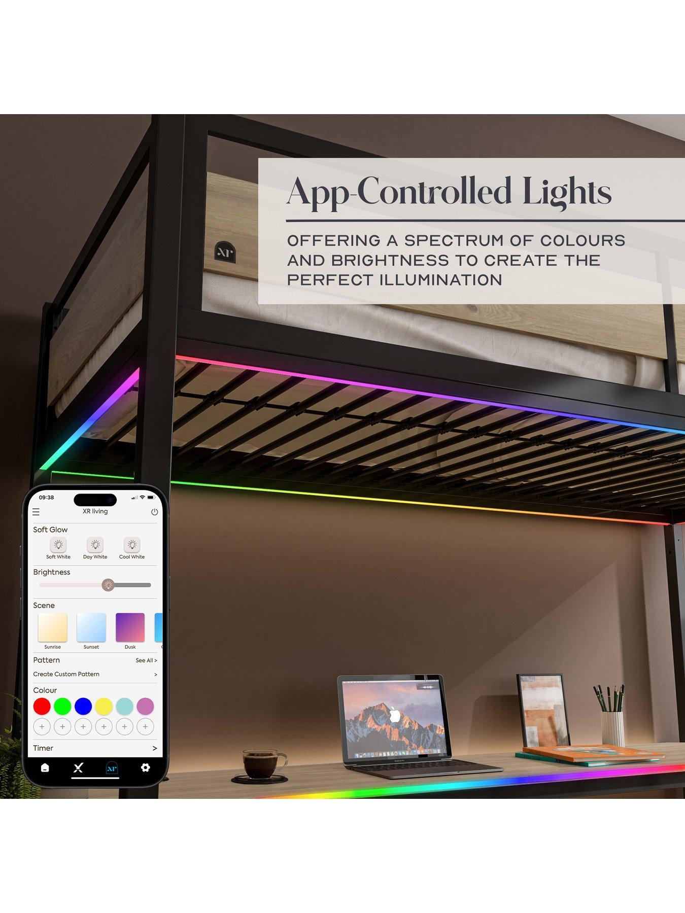 XR Living Denver High Sleeper With Wireless Charging and App Controlled LED Lights - Single - Oak/BlackIntroducing the Denver High Sleeper with App control lights and wireless charging, the ultimate space-saving solution designed to bring functionality and style to your bedroom. This modern single high sleeper bed combines robust metal for stability with warm wood accents for a touch of natural elegance, ensuring it complements any décor.More than just a place to sleep, the Denver High Sleeper is a multifunctional centerpiece that enhances both the aesthetic and functionality of your space. The sleek combination of metal and wood creates a contemporary yet inviting look, while integrated LED lighting options provide the perfect illumination for studying, reading, working, or setting the ideal ambience. The lights are fully customisable using the Neo Motion App. Under-Bed Space - Maximises room space by elevating the sleeping area, creating ample space underneath for the built in desk which features 10w wireless charging. There is a secure and easy-to-climb ladder, seamlessly integrated into the design for safe access to the upper bunk. App Controlled Dual-Level Lighting - Equipped with App and remote-controlled LED RGB lights, offering a spectrum of colours and brightness to create the perfect ambience. Easily switch between downlighting that illuminates the desk area or a light feature around the desk edge to create ambience. Combine the lighting to brighten both the upper and lower sections of the bed, providing versatile illumination based on your needs. Mood Lighting - Includes three tones of white light: Cool White: For a bright and energetic feel. Day White: Balanced light that mimics natural sunlight. Soft White: Soft and cosy lighting for a relaxing atmosphere.