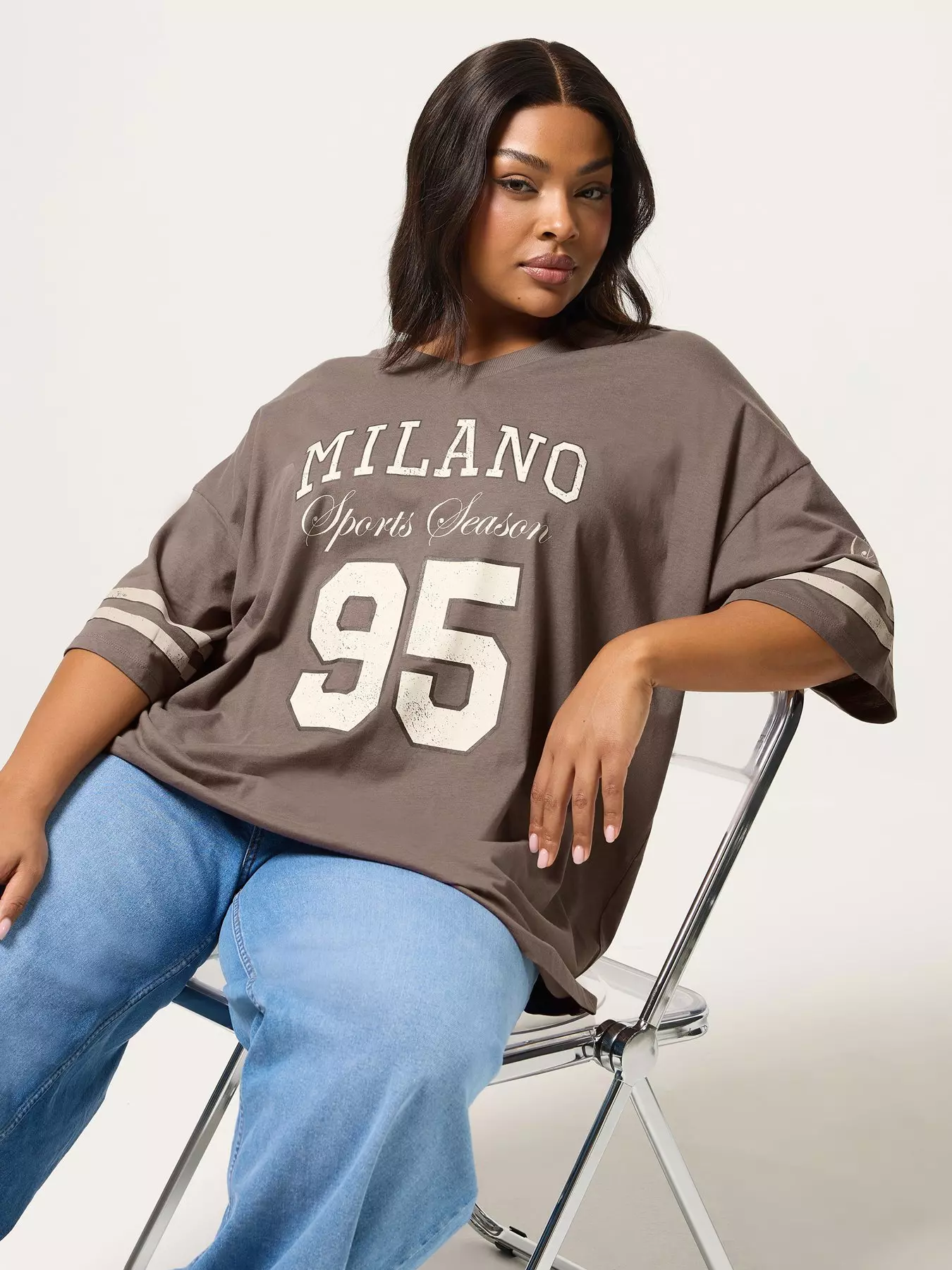 YoursCurve Placement Boxy Varsity T-Shirt - Brown