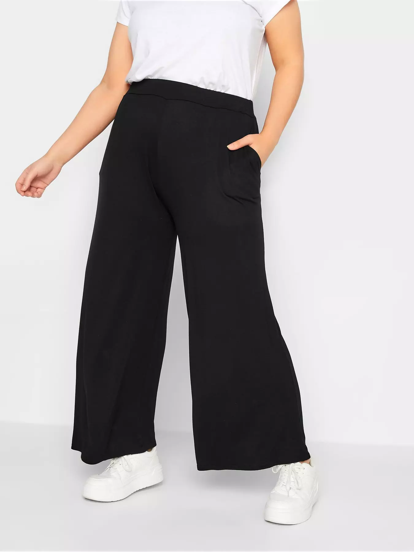 Introduce these plus size wide leg trousers into your everyday collection. Made from a comfortable jersey fabric, they feature two side pockets and an elasticated waistband for the perfect fit. Team with a t-shirt and trainers for easy off-duty appeal.- Material Content: 5% elastane95% viscose